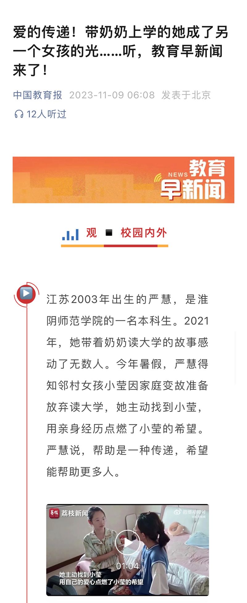 【中国教育报】爱的传递!带奶奶上学的她成了另一个女孩的光……