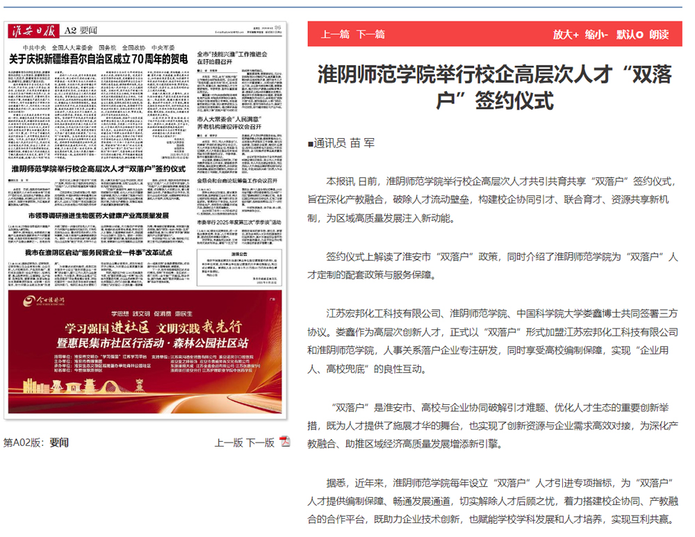 “双落户”是淮安市、高校与企业协同破解引才难题、优化人才生态的重要创新举措,既为人才提供了施展才华的舞台,也实现了创新资源与企业需求高效对接,为深化产教融合、助推区域经济高质量发展增添新引擎。