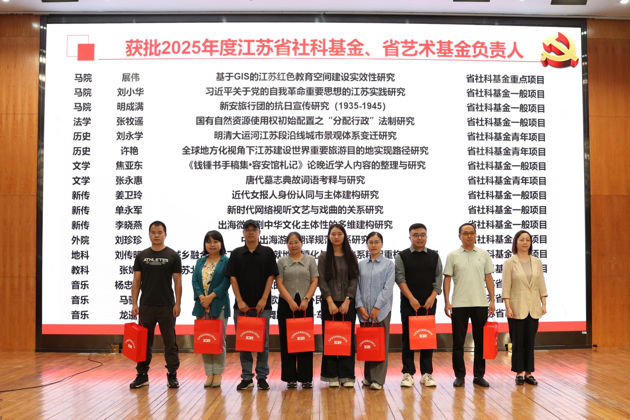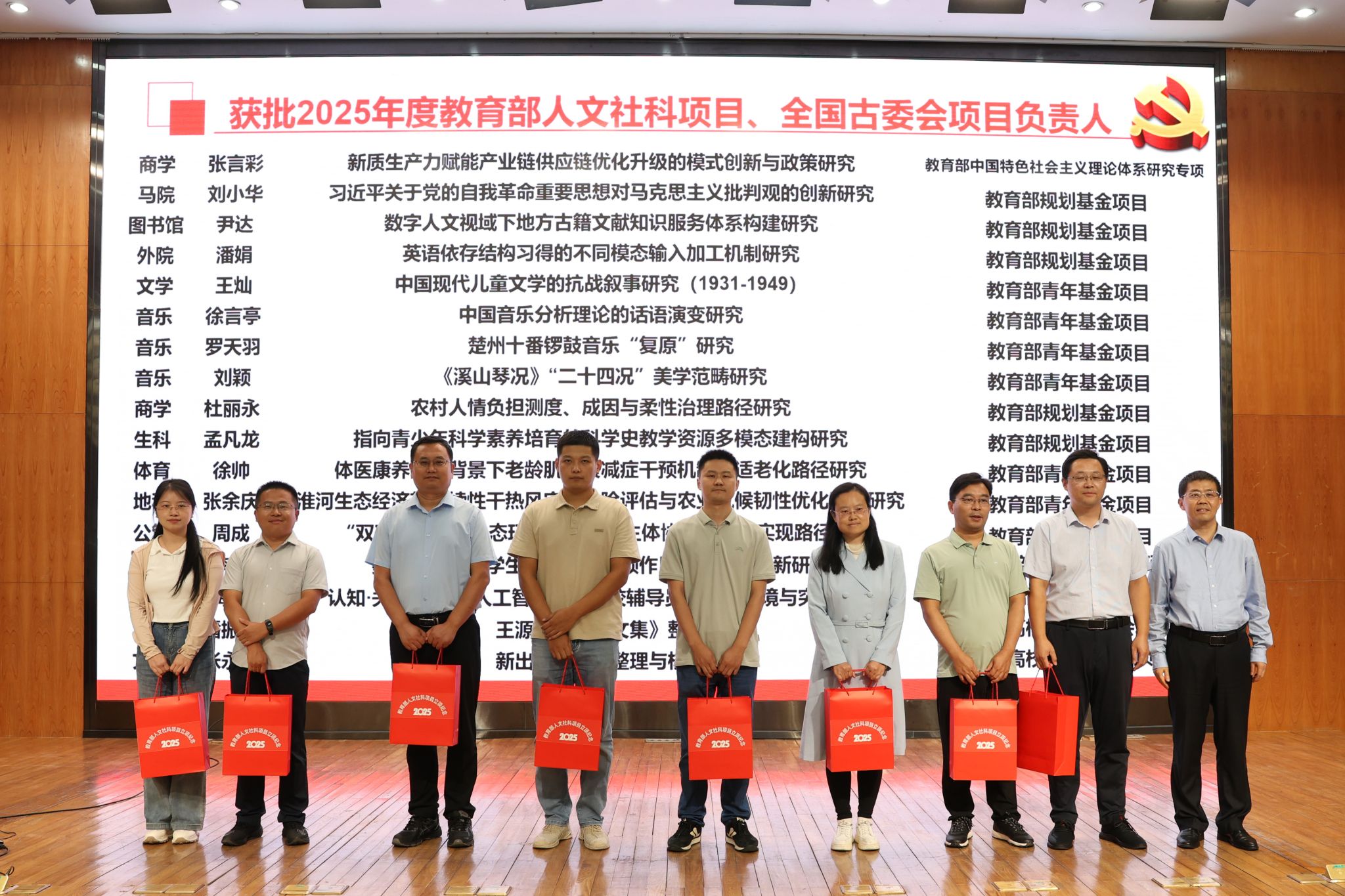 会议表彰了获批本年度国家社科基金、教育部人文社科项目、省社科基金、省艺术基金,以及全国高校古委会项目的41位项目负责人,赵祥祥代表学校向立项老师表示热烈祝贺并颁发纪念品。