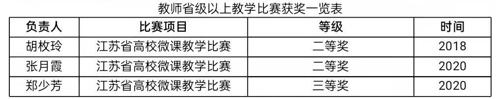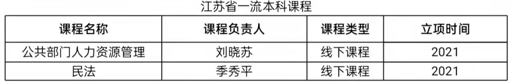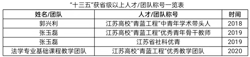 师资队伍建设。现有专职教师50人,其中,教授12人,副教授24人,博士30人。有江苏高校“青蓝工程”优秀中青年学术带头人3人、优秀青年骨干教师3人,江苏省社科优青1人、校级“教学名师”1人、江苏高校“青蓝工程”优秀教学团队1个。